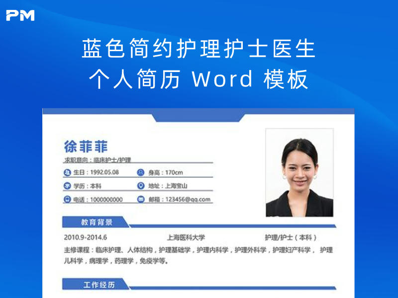 这是一套关于个人简历的word范文模板,包含个人简历、护理等主题内容,也可用于个人简历、护理简历文档模板使用。蓝色简约护理护士医生个人简历 Word 模板主体文字图片皆可替换修改。
