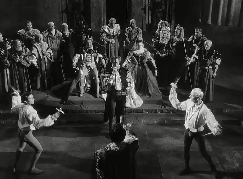 例如在揭穿克劳狄斯真面目的那场戏里,摄影机一直对着那些演员移动,镜头围绕着宫廷半圆形来回往返,每次在近景中就突出刻画不同角色的精神状态:国王恐惧心理的增长,霍拉旭的如梦初醒,哈姆雷特发狂似的胜利情绪,最后是在场者全部都发现了国王克劳狄斯神色失常,终于若有所悟,真相大白。片中奥立弗的念白和表情将哈姆雷特的性格悲剧诠释得丝丝入扣,简·西蒙丝饰演的奥菲莉亚则纯美至极。