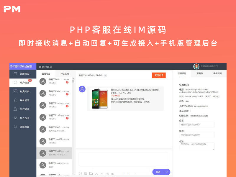 PHP 客服在线IM源码,支持自动刷新(网页即时接收消息)+自动回复+可生成接入+手机版管理后台:弹窗接入,微信公众号接入,网页链接接入。