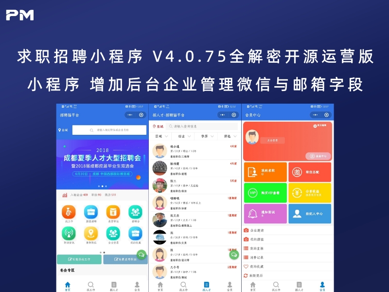 文章标题:求职招聘小程序 V4.0.75全解密开源运营版小程序 增加后台企业管理微信与邮箱字段