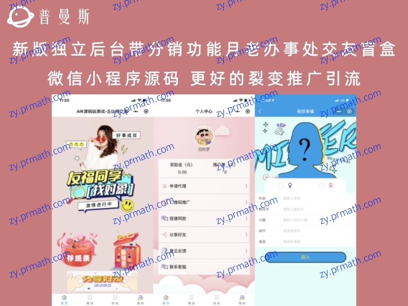 文章标题:新版独立后台带分销功能月老办事处交友盲盒微信小程序源码 更好的裂变推广引流