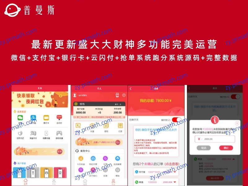 文章标题:最新更新盛大大财神多功能完美运营 微信+支付宝+银行卡+云闪付+抢单系统跑分系统源码+完整数据