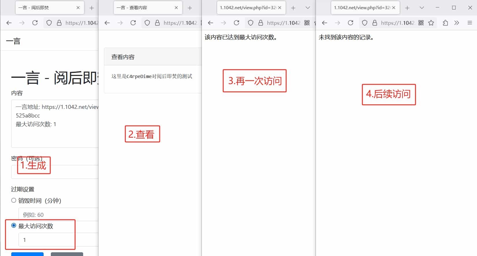 “阅后即焚”平台的核心功能是允许用户创建临时的文本内容,并在设定条件满足后销毁这些内容。用户可以通过时间或最大访问次数来控制内容的存活时间。该平台还支持对内容设置访问密码以增强隐私性。