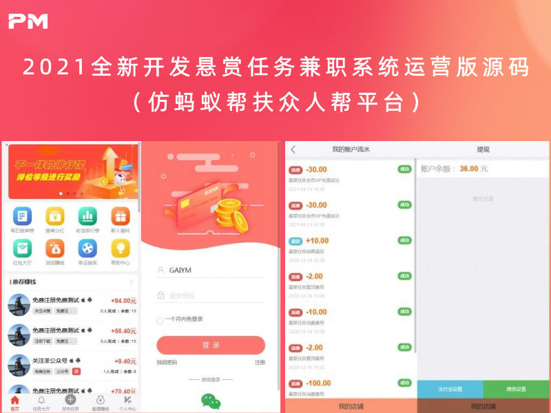 2021全新开发悬赏任务兼职系统,仿蚂蚁帮扶众人帮平台,功能齐全,包含接任务,发布任务,店铺关注,置顶推荐,排行榜,新人福利,红包大厅,红包抽奖,任务步骤,微信绑定,分销推广,举报维权,vip会员特权等众多功能,已有客户上线运营,支持微信绑定登陆。带APP推广页。